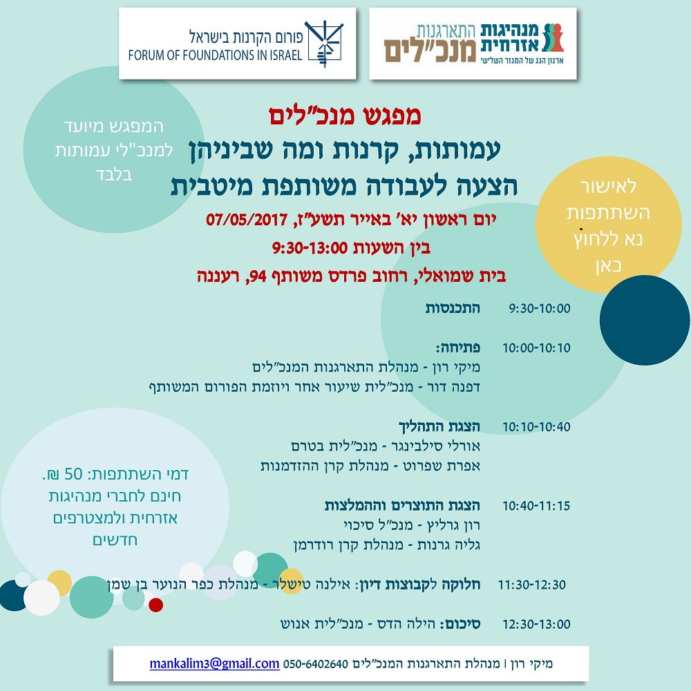 ב-7.5.17 בין השעות 9:30-13:00 יתקיים מפגש ייעודי למנכ"לי עמותות בלבד בו יוצגו התהליך ותוצריו ונחשוב יחד על המשך התהליך.